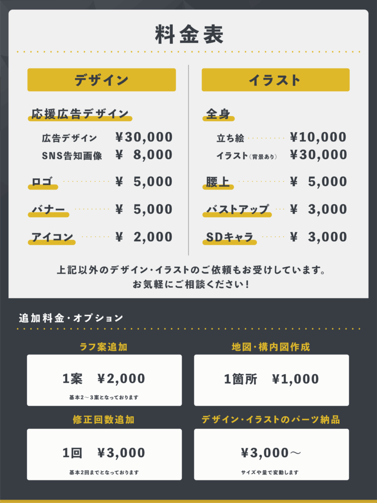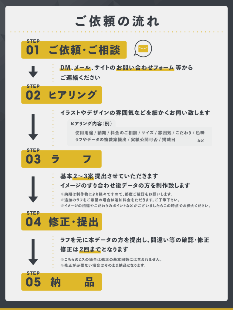 REQUEST 2025.01.172025.10.22 ご覧いただきありがとうございます。当サイトでは、デザイン・イラスト制作のご依頼を随時受け付けております。ご希望のイメージや目的に合わせて丁寧にヒアリングしながら制作を進めてまいります。 「まず相談してみたい」「見積もりだけお願いしたい」といったご相談も大歓迎です!どうぞお気軽にお問い合わせください。 ヒアリングシート お問い合わせ